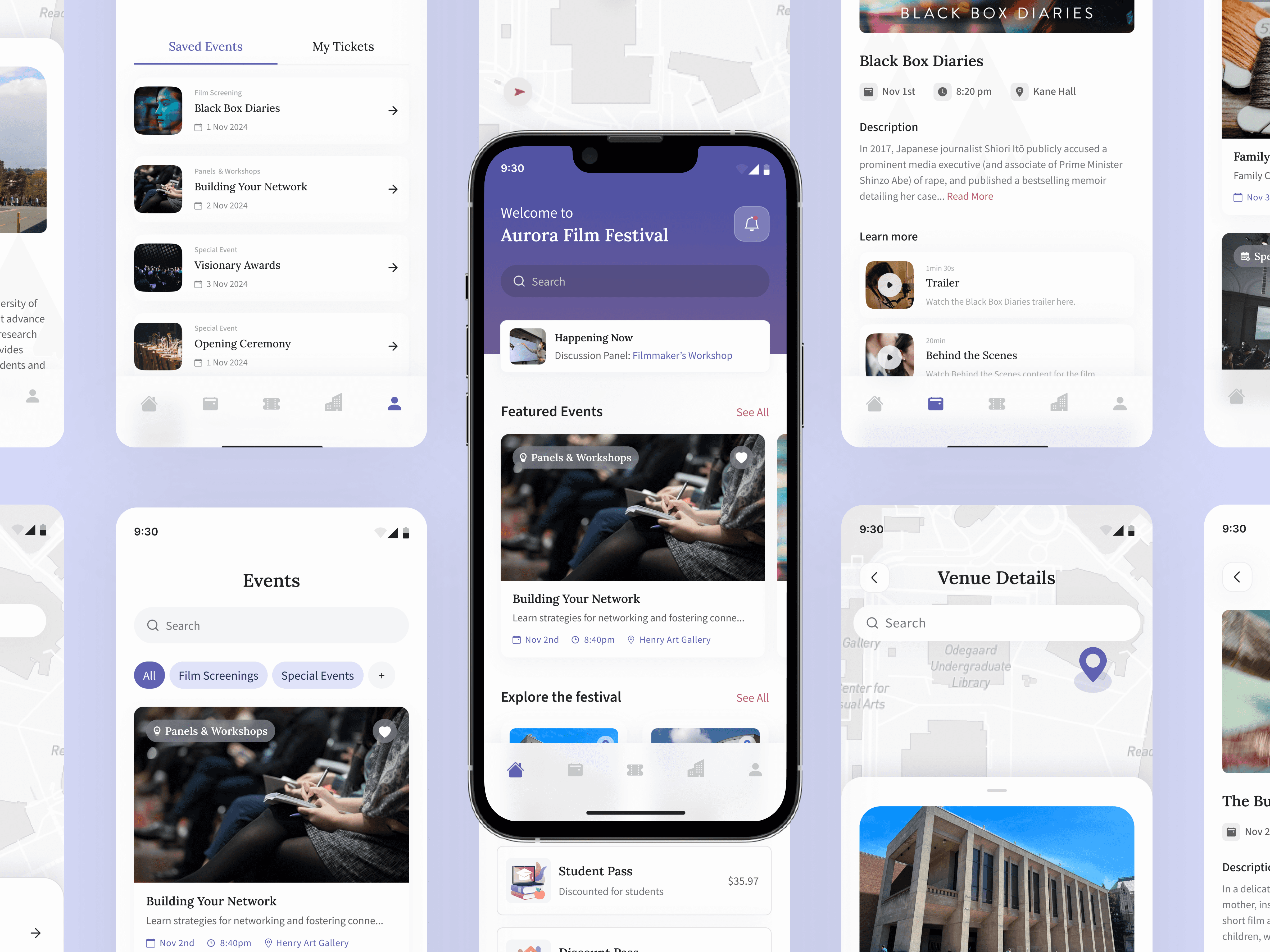 Aurora Film Festival App is a mobile interface designed for a fictional film festival, conceptualized as part of a 10-week project. Aurora is a women's film festival dedicated to celebrating and uplifting women in cinema. The app provides access to festival information, ticketing, and networking opportunities.