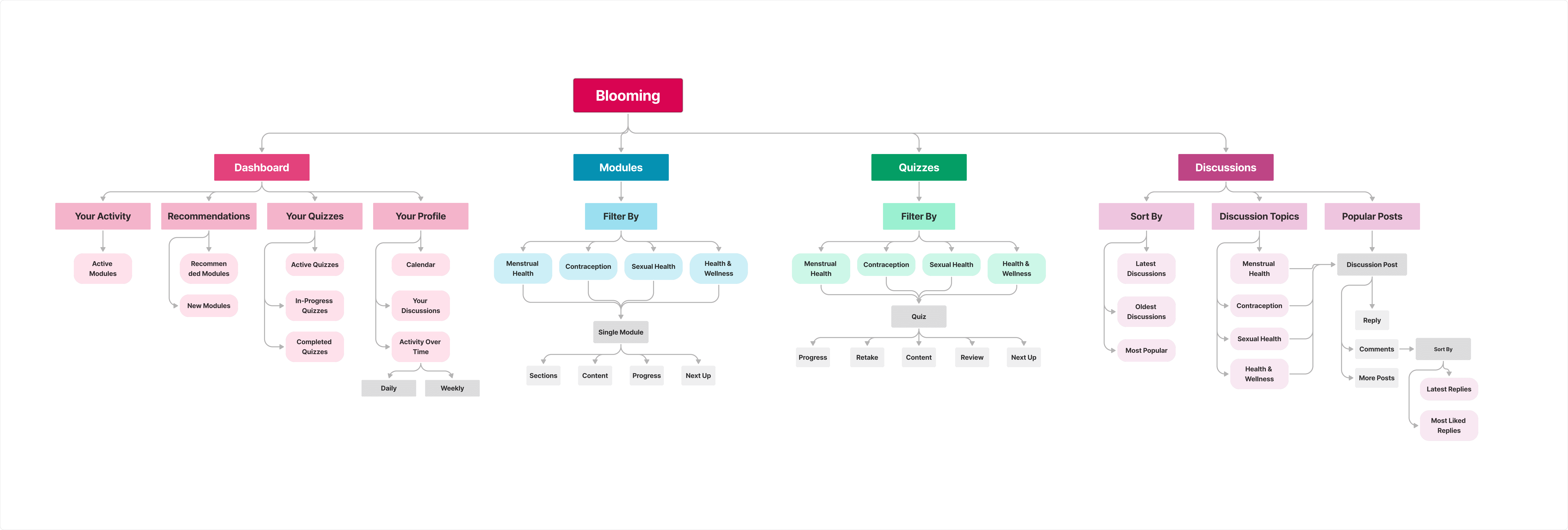 Blooming’s mission is to provide young women with the knowledge and support they need to navigate their reproductive health with confidence. To reflect this, we used a warm and vibrant color palette and a clean and simple font to create a sense of encouragement and sincerity.