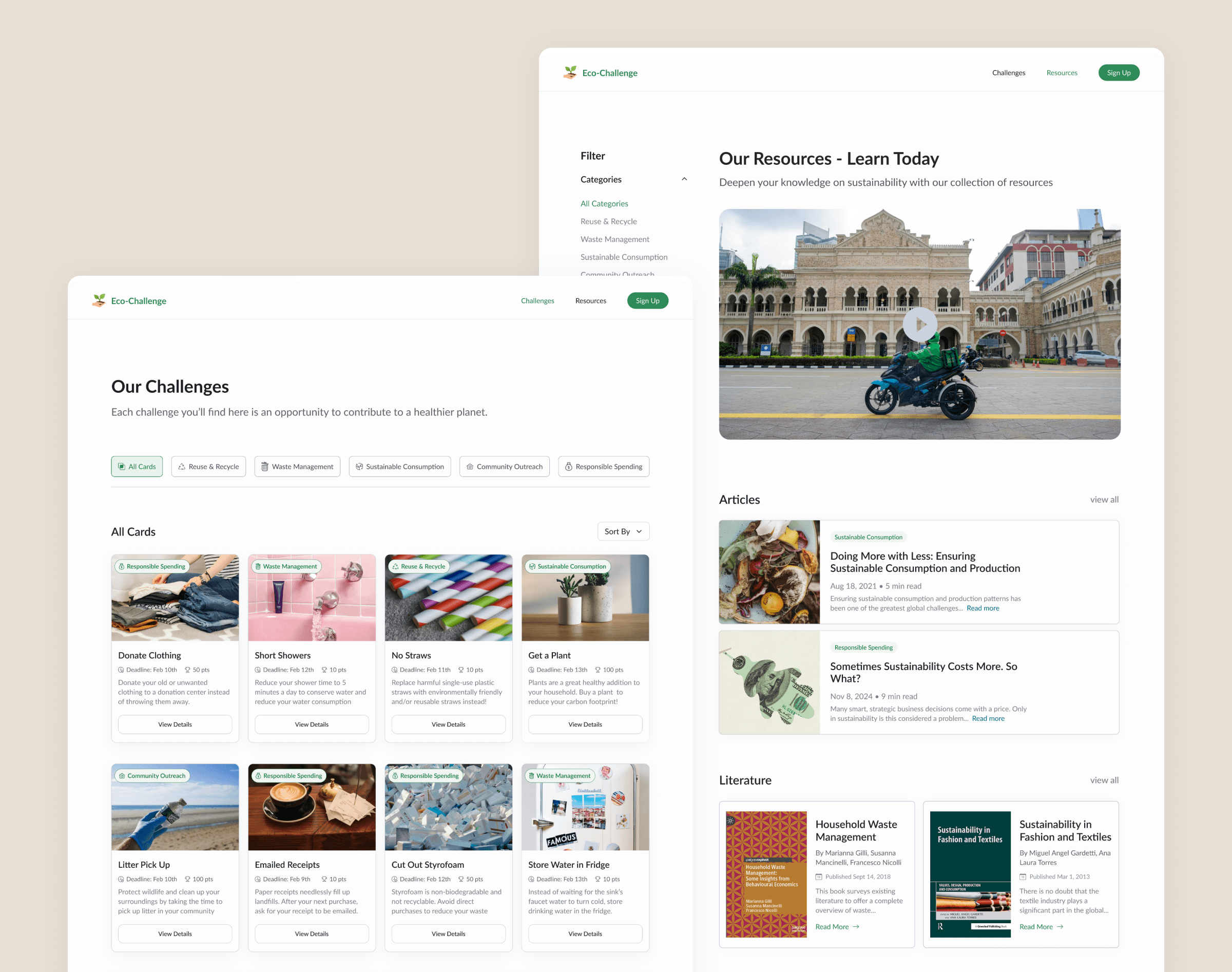 A website with a series of challenges to encourage people to adopt eco-friendly habits and make conscious choices towards sustainable consumption.